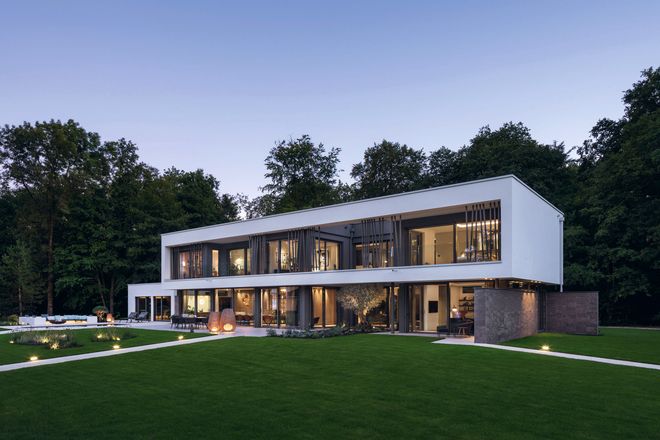 Mit klaren Linien, großflächig geöffneten Fassaden und exklusiver Innenausstattung fällt beispielsweise das neue Ausstellungshaus in der World of Living von WeberHaus in Rheinau-Linx auf. Entworfen wurde es vom Londoner Architekten Nick Blunt. Das Gebäude hat ungewöhnliche Proportionen: Bei einer Länge von 25 Metern beträgt die Haustiefe nur neun Meter, was eine klare Anordnung der Innenräume möglich macht. Das erste Stockwerk ragt auf allen Seiten minimal über das Erdgeschoss hinaus und wirkt beinahe so, als würde es schweben. Ein Blickfang sind die Holzstäbe aus Lärche, die teilweise vor den Fenstern platziert wurden - sie dienen als Stilelement und Sichtschutz. "Die Villa zeigt auf eindrucksvolle Weise, welche Möglichkeiten der Holzrahmenbau bietet“, resümiert Architekt Nick Blunt.